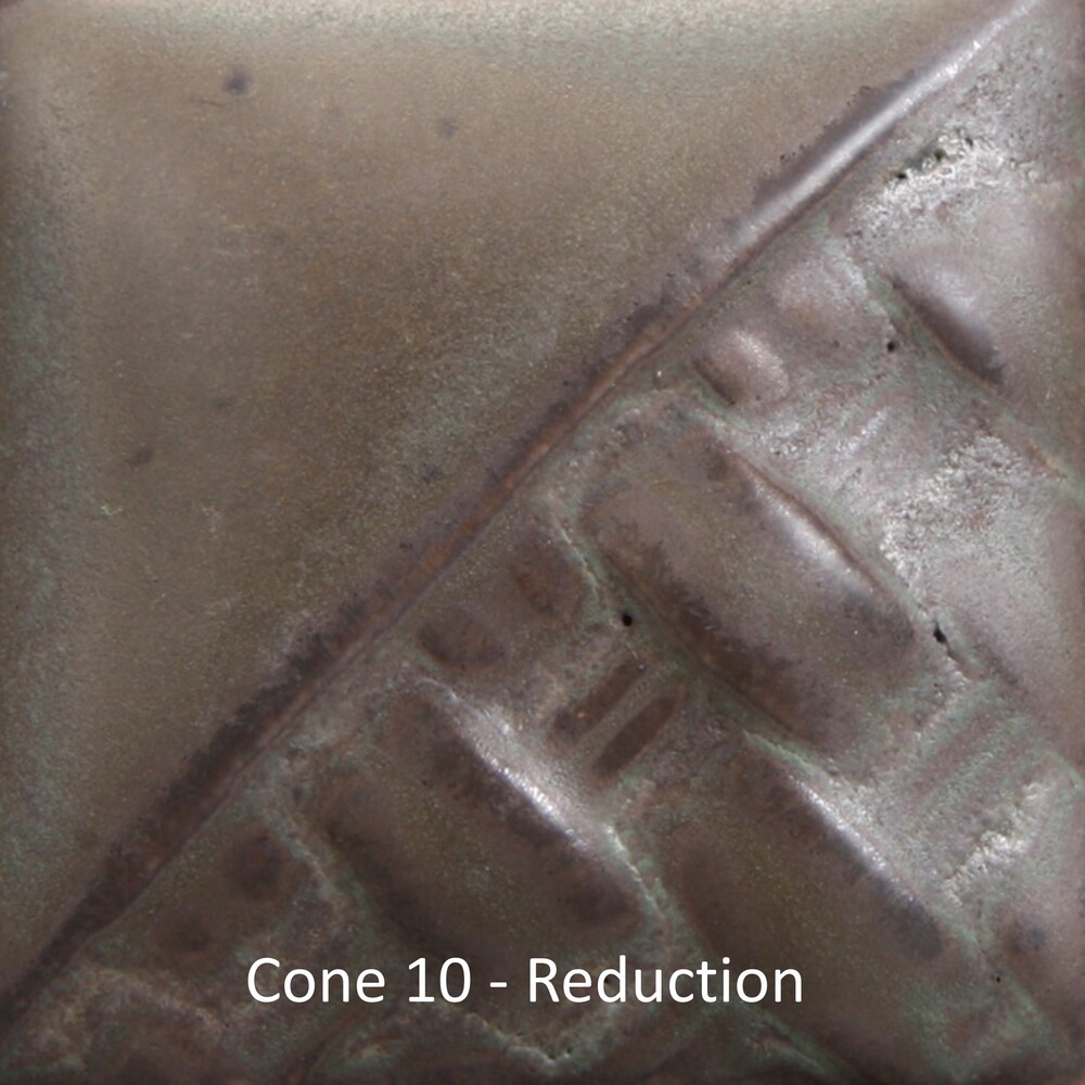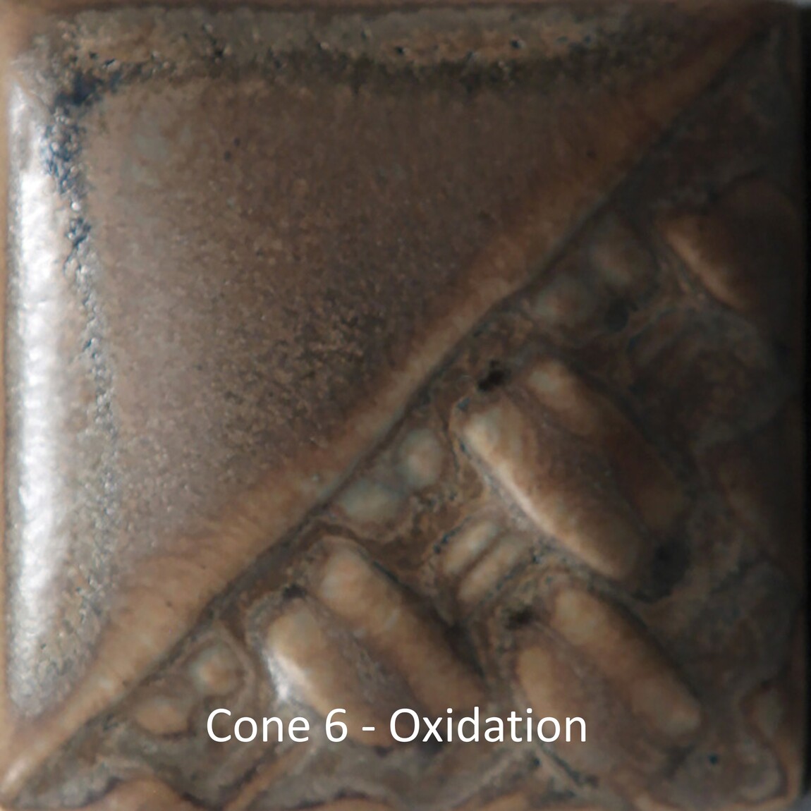 Cone 6 oxidation (see image): Leather is a matte brown glaze that displays shades of blue and green. The variation of the glaze is dependent on application. The thicker the application, the more homogenous the color will be. The glaze will break translucent where thinner and pool darker around surface textures.