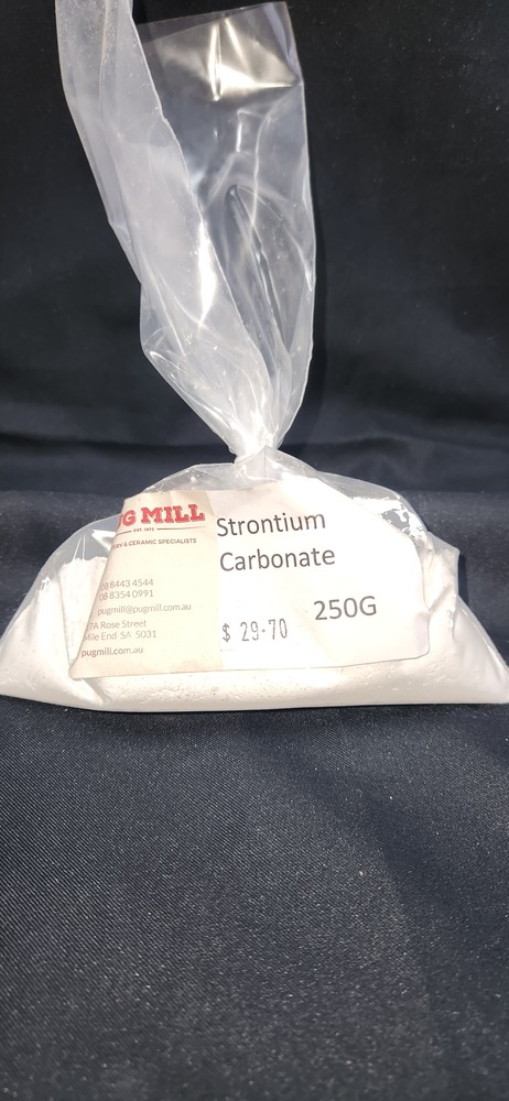 Use as a safe Barium Carbonate substitute. Most glazes will accept Strontium Carbonate as a substitute. Glazes for low temperature vitreous bodies can be aided through the use of strontia. Viscous zirconium containing glazes can be smoothed out with the addition of strontia. The added fluidity with strontia when replacing calcium and/or barium promotes interface reaction, improving glaze fit, glaze hardness and scratch resistance.
